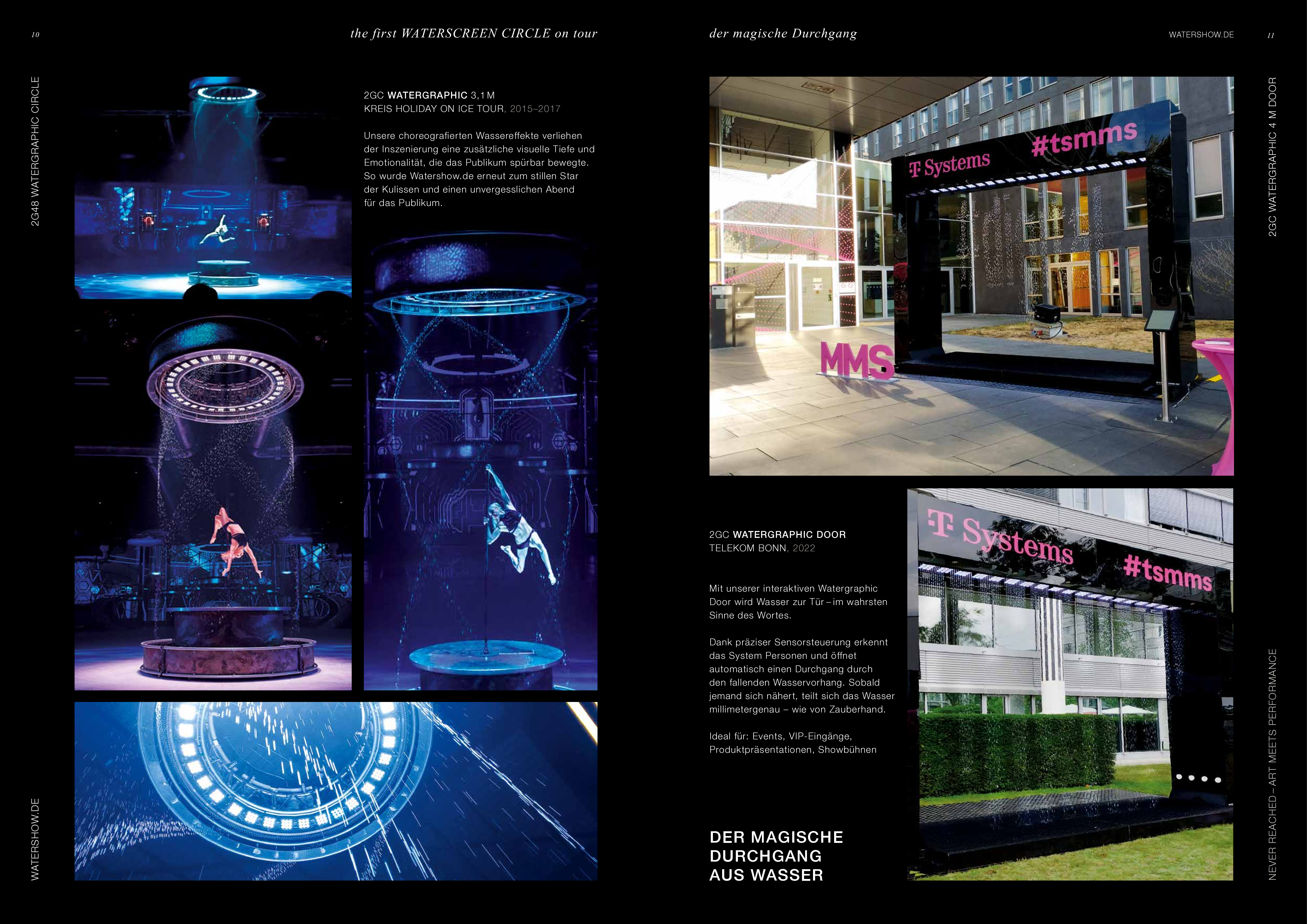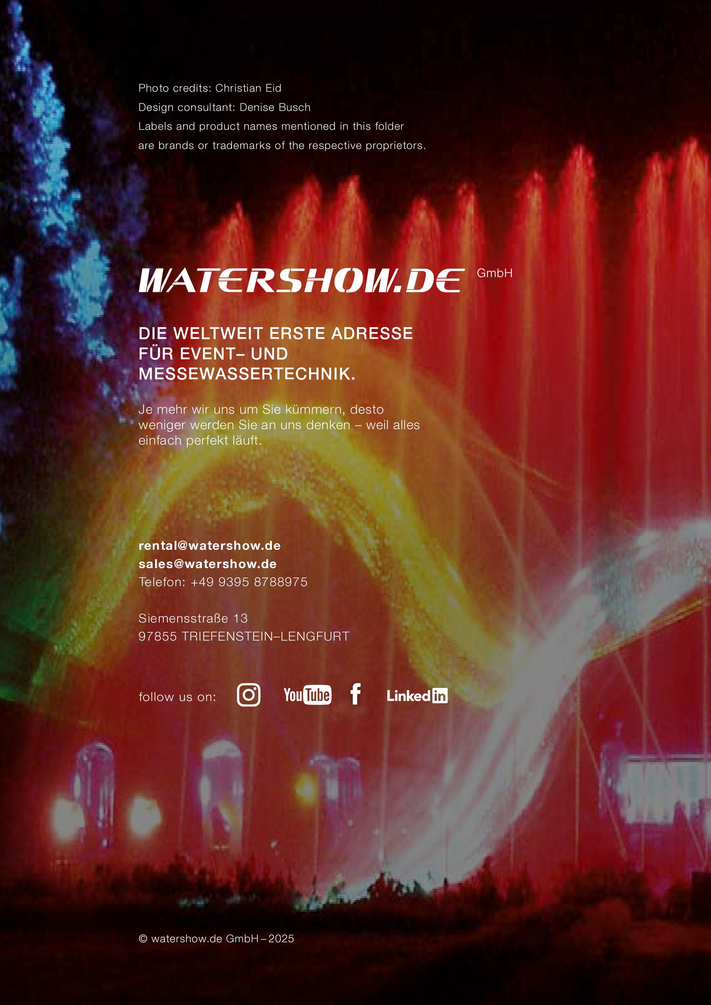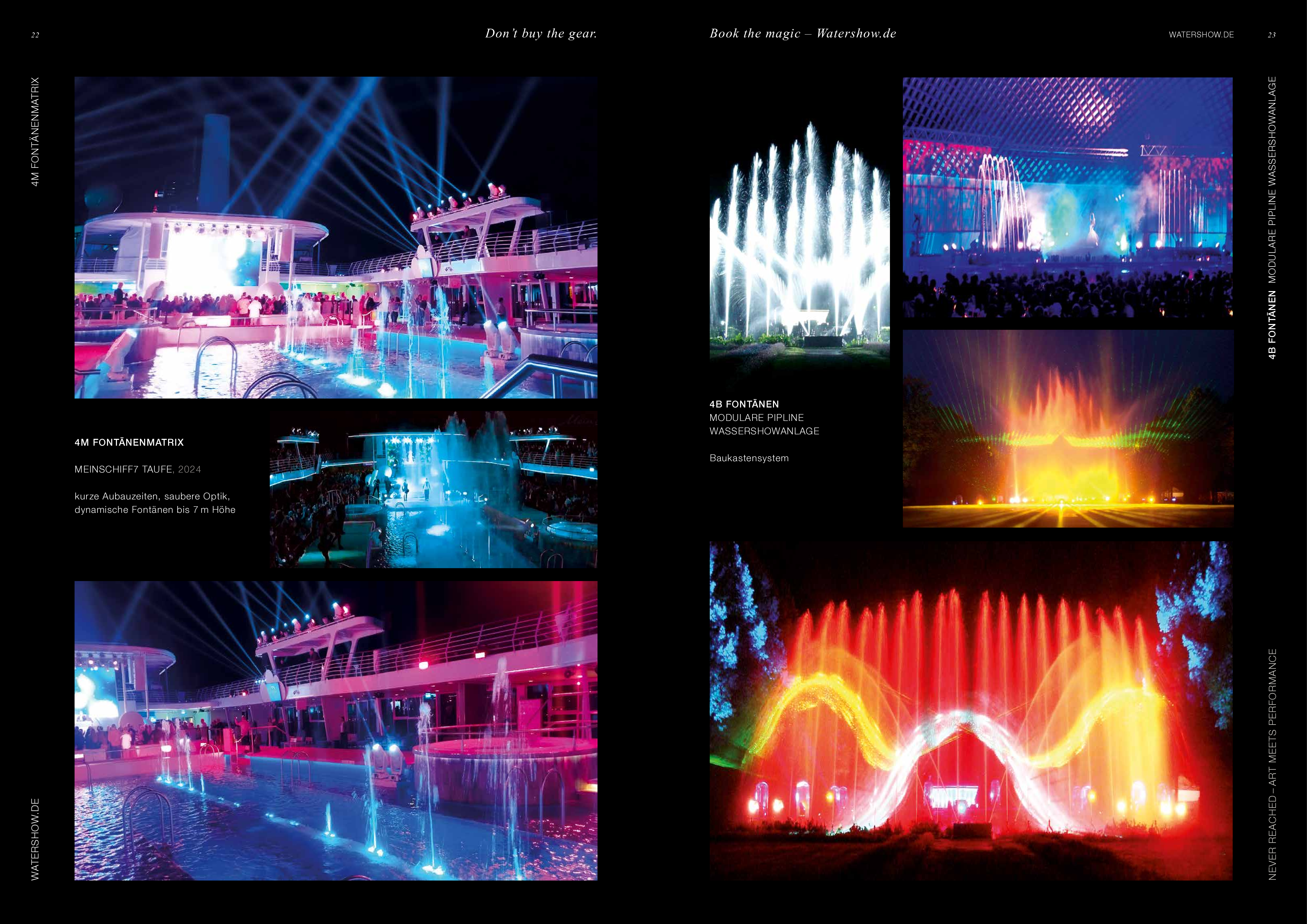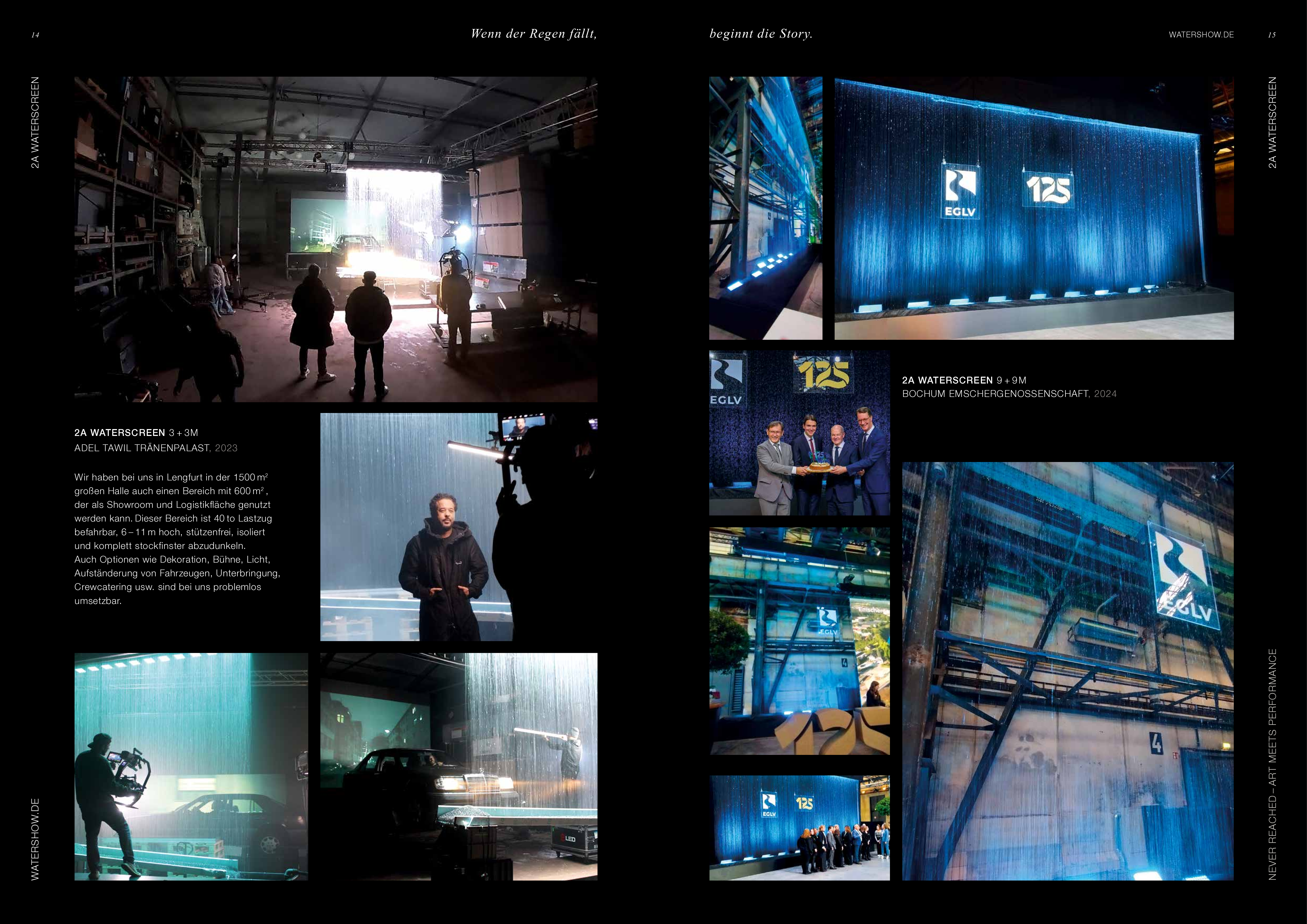 Watershow.de GmbH transforms water into unforgettable experiences. From dazzling fountains and elegant water walls to high-tech waterscreens that write logos and images with falling drops — every show is a one-of-a-kind highlight. With custom solutions, flawless engineering, and stunning visual impact, Watershow.de makes brands shine and events unforgettable.
