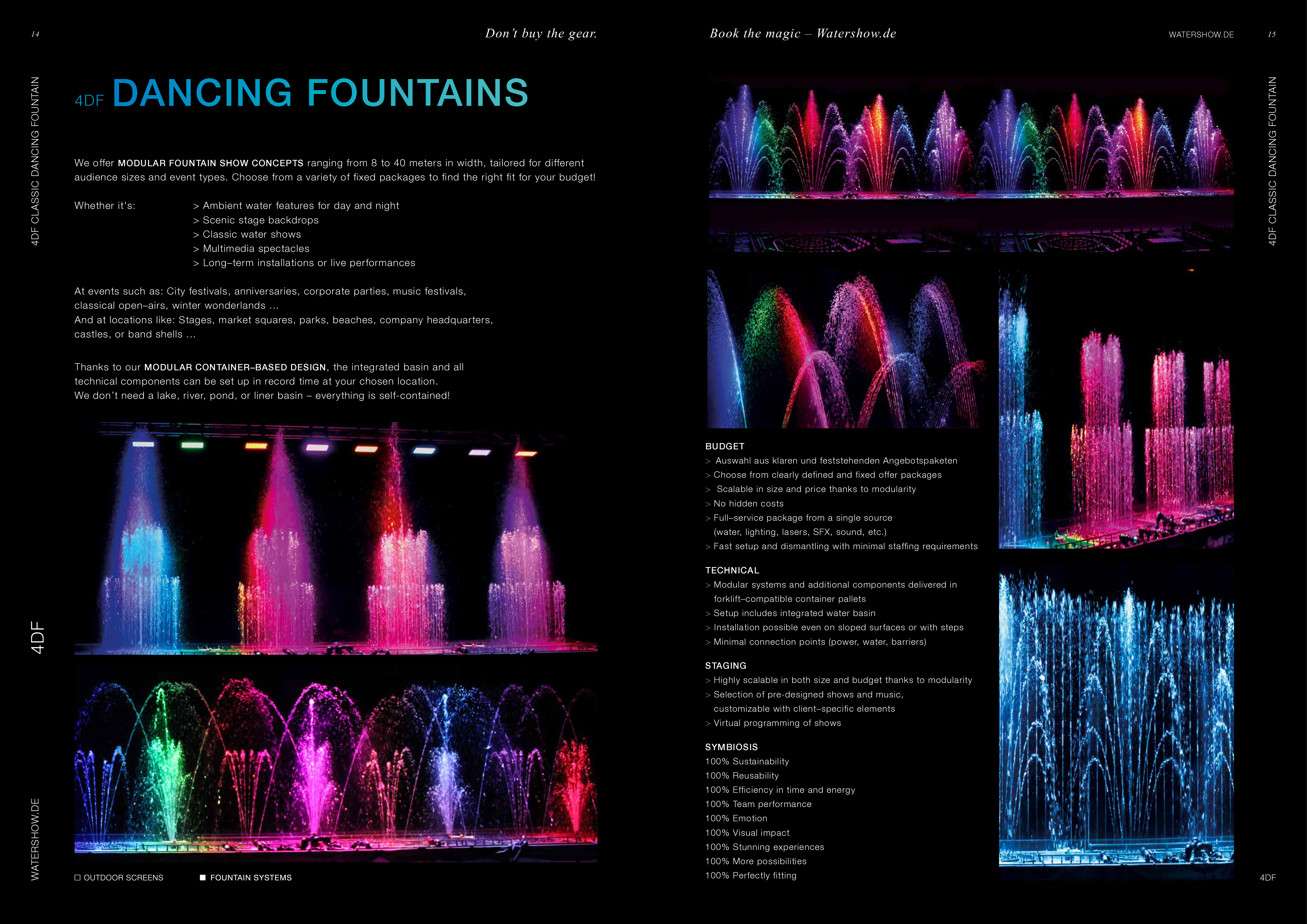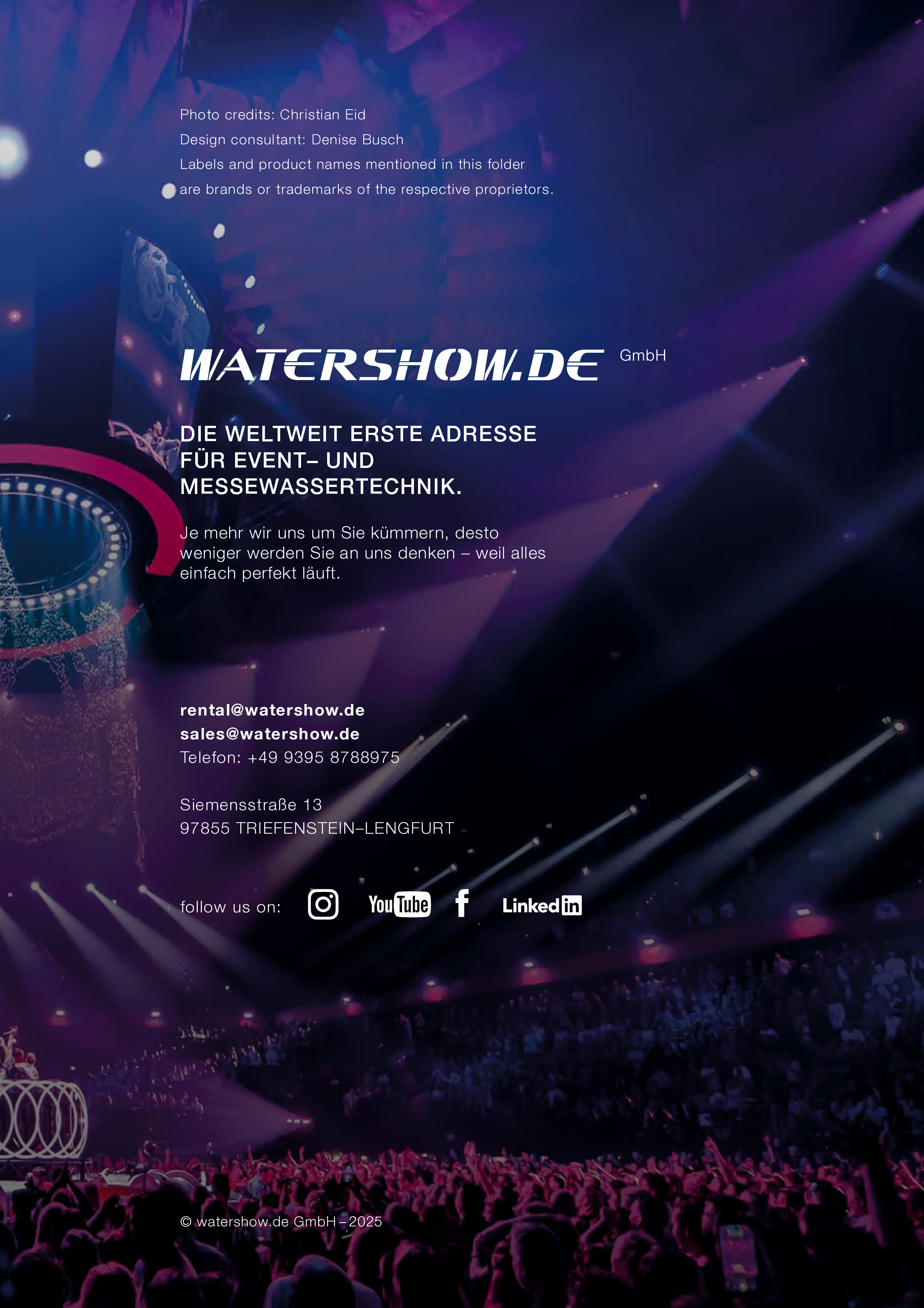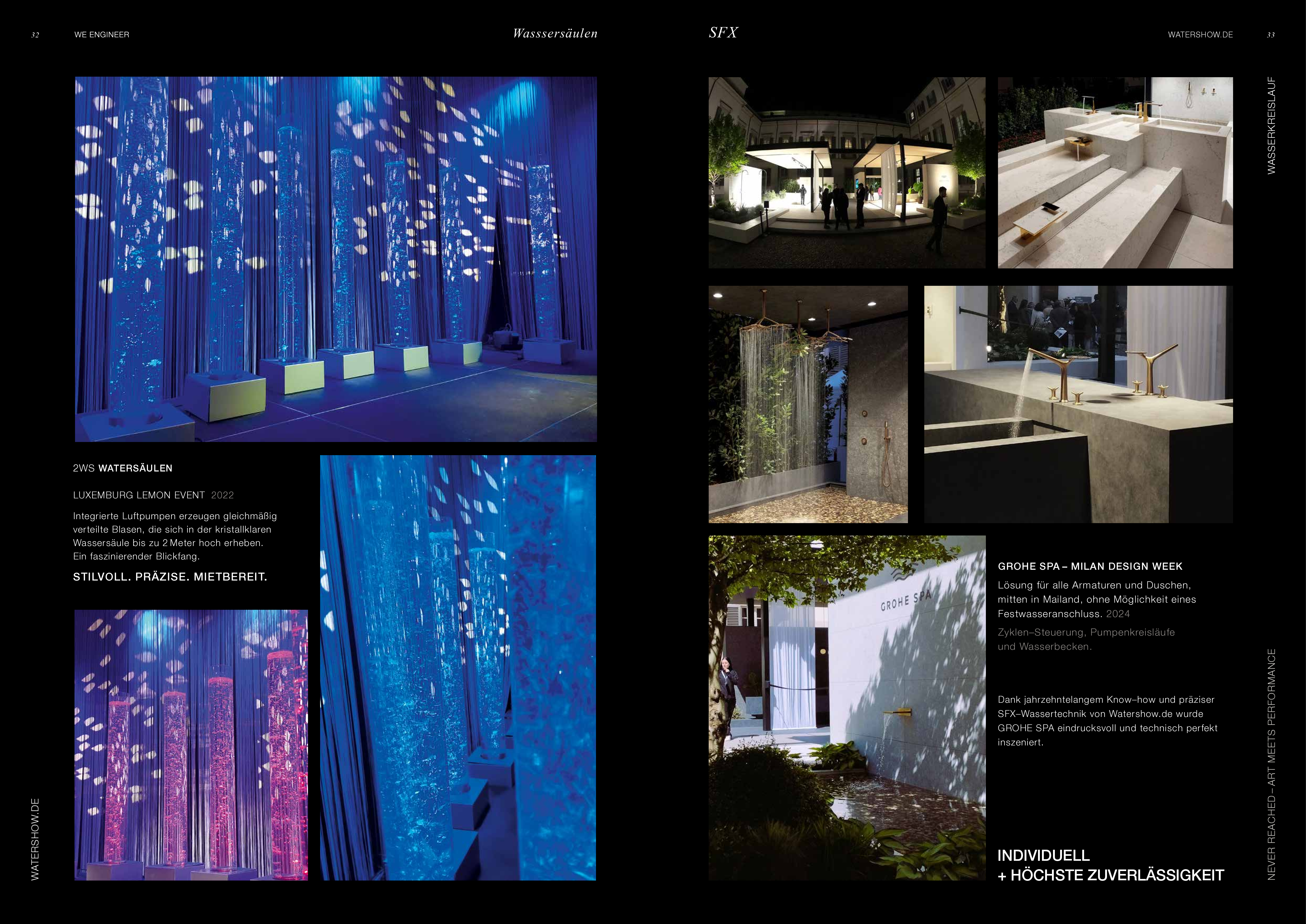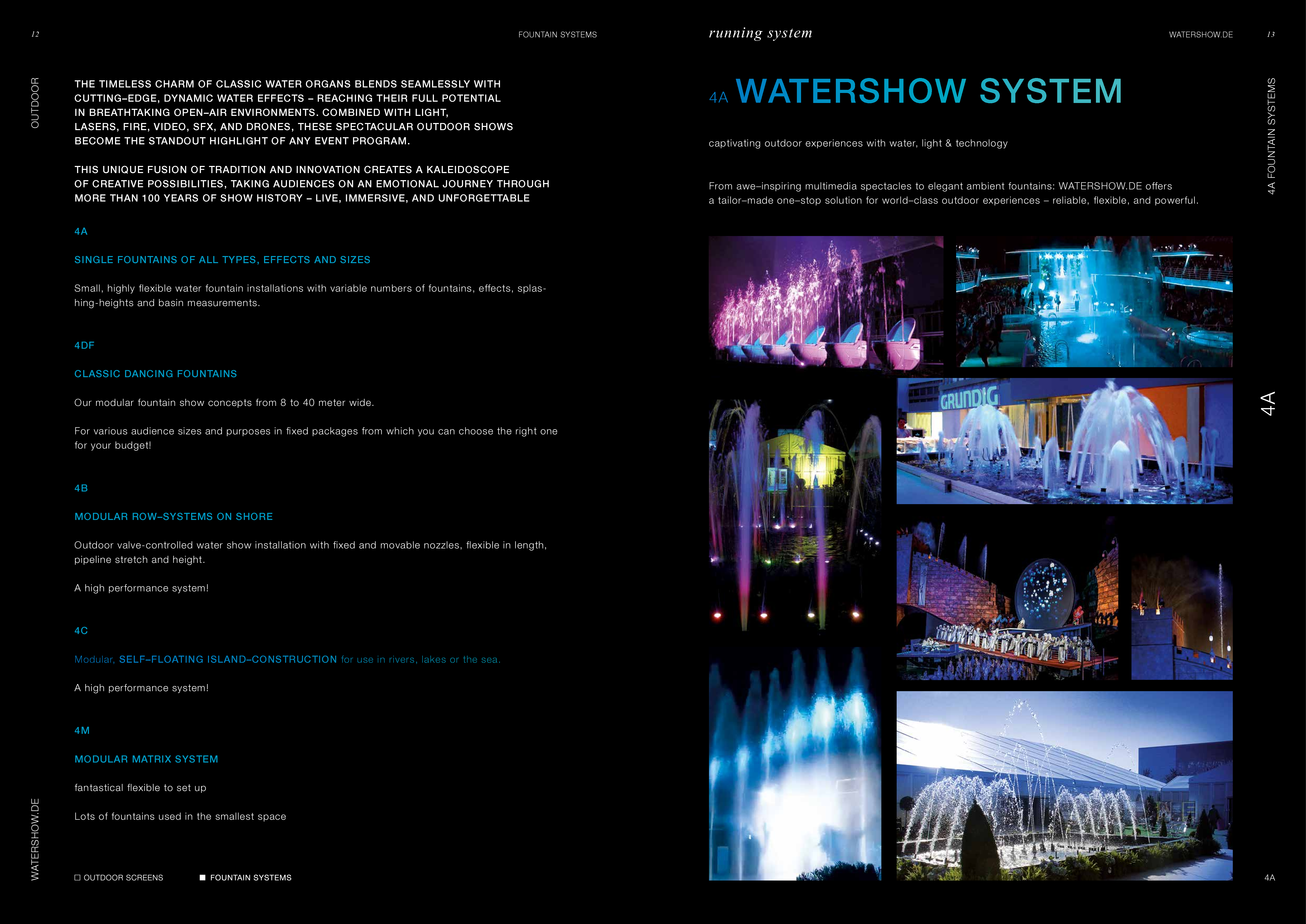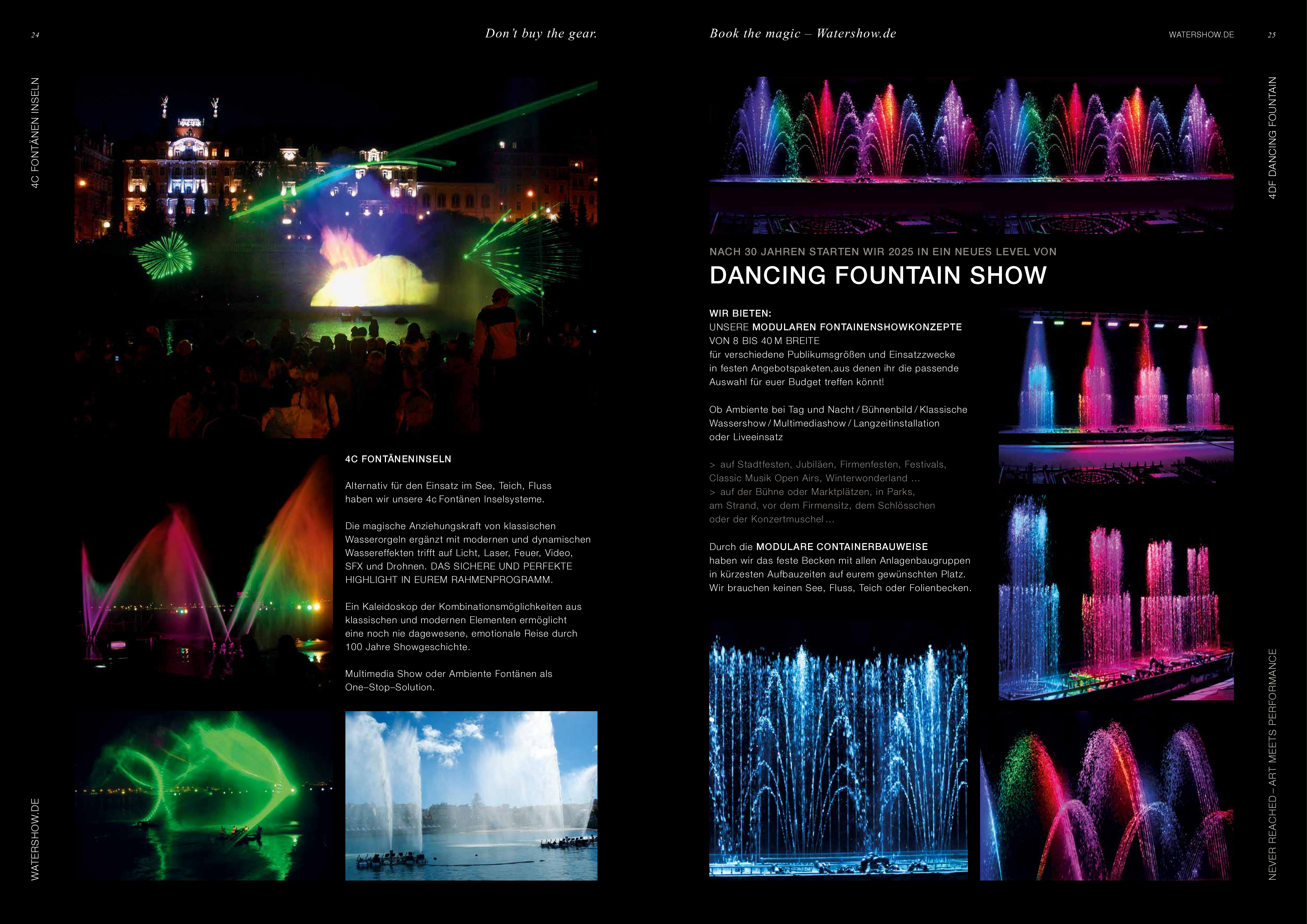 Watershow.de GmbH transforms water into unforgettable experiences. From dazzling fountains and elegant water walls to high-tech waterscreens that write logos and images with falling drops — every show is a one-of-a-kind highlight. With custom solutions, flawless engineering, and stunning visual impact, Watershow.de makes brands shine and events unforgettable.